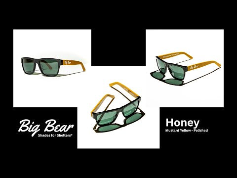 Shiny, sweet, pretty, all the characteristics of Honey herself. Mustard yellow acetate temples with black acetate front frame and vintage green lenses with a polished finish.